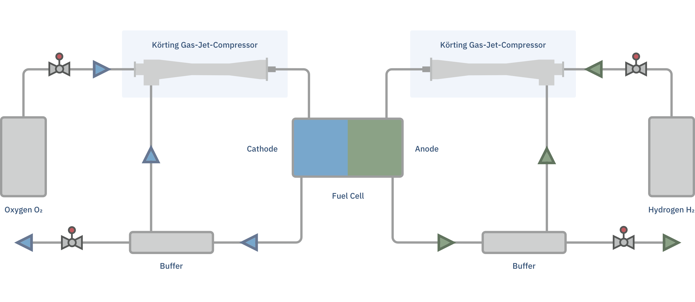 - The gas blend is refed into the fuel cell stack with fresh hydrogen from the tank (recirculated).