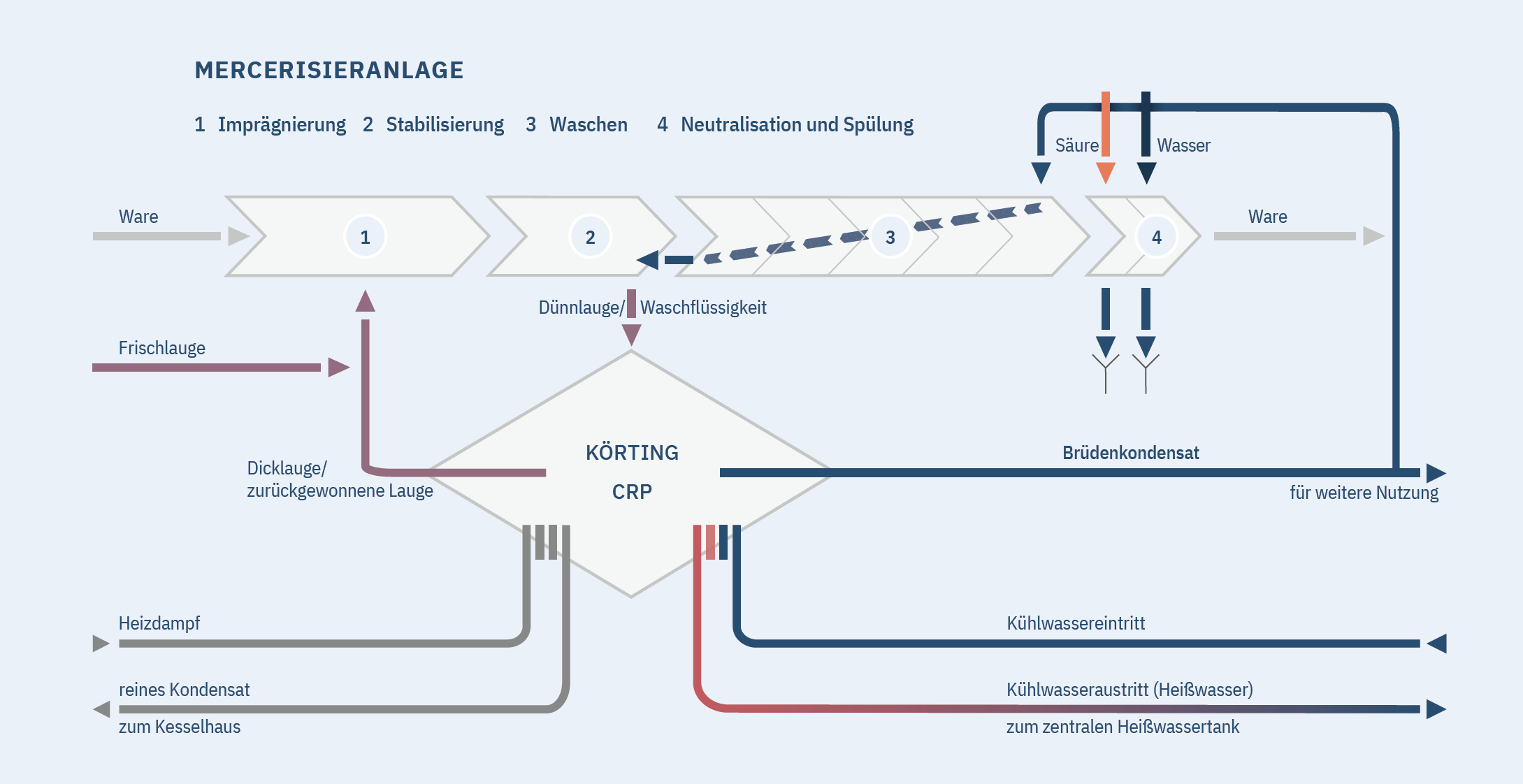 Gerade in der Textilbranche ist Nachhaltigkeit ein wichtiges Ziel für viele Unternehmen geworden. Dank der Körting Technologie sind Textilunternehmen in der Lage, Nachhaltigkeit in den Prozess der Mercerisation zu bringen. Mithilfe der Rückgewinnung muss der Anlagenbetreiber keine Anstrengungen zur Entsorgung der Dünnlauge machen. Dadurch profitiert die Umwelt direkt. Durch die Wiederverwendbarkeit der Lauge lassen sich jährliche Einsparungen von einer Millionen Euro und mehr erreichen. Die Amortisationszeit der Laugen-Rückgewinnungsanlage ist innerhalb eines Jahres möglich. Danach erzielen Anlagenbetreiber eine dauerhafte Senkung der Betriebskosten der Mercerisation. Schon bei der Auslegung der Anlage lassen die Körting Ingenieure das Einsparpotenzial in die Kalkulation einfließen.