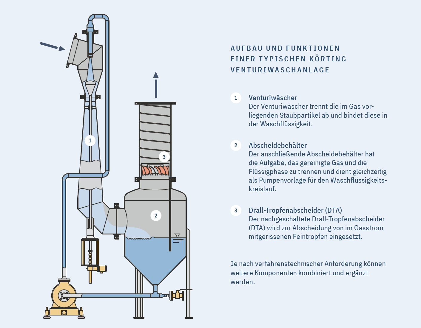 Der Venturiwäscher trennt Gas und Staubpartikel. Der anschließende Abscheidebehälter hat die Aufgabe, das gereinigte Gas und die Flüssigphase zu trennen und dient gleichzeitig als Pumpenvorlage für den Waschflüssigkeitskreislauf.