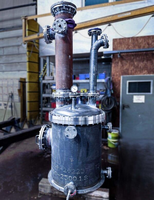 Die Vierlinge sind aus C-Stahl (Kohlenstoffstahl) gefertigt und außen lackiert. Mit 2,80 Meter Höhe und 800 mm im Durchmesser sind sie relativ klein, jedoch durchaus fein: die Innenseite ist jeweils mit dem Spezialkunststoff E-CTFE beschichtet, einem Polymer, das, ähnlich wie Teflon, von den meisten Säuren nicht angegriffen wird und sich darüber hinaus durch eine sehr gute thermische Beständigkeit sowie Antihaftwirkung auszeichnet. Doch warum ist der Behälter aus C-Stahl mit dem Kunststoff ausgekleidet und nicht komplett aus Kunststoff hergestellt? Wird ein Wäscher normalerweise bei Atmosphärendruck betrieben, so handelt es sich in diesem Fall um einen Druckbehälter, der für drei bar Überdruck ausgelegt ist.